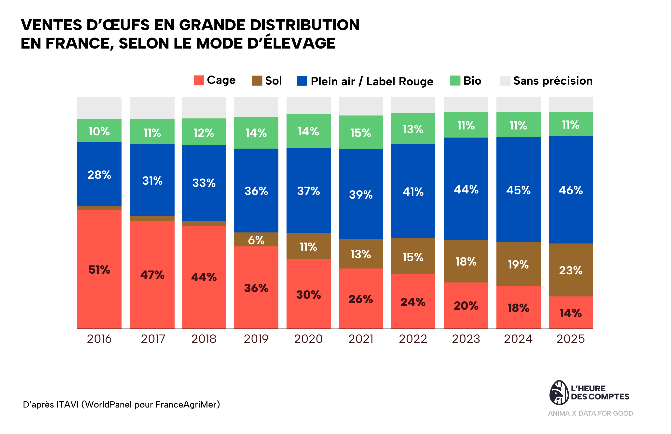 Grâce aux engagements des supermarchés, la part d’œufs cage vendue en grande distribution est aujourd’hui historiquement basse, de 51 % en 2016 à 14 % en 2025. Cette évolution s’est faite au profit des œufs de poules élevées au sol et en plein air.